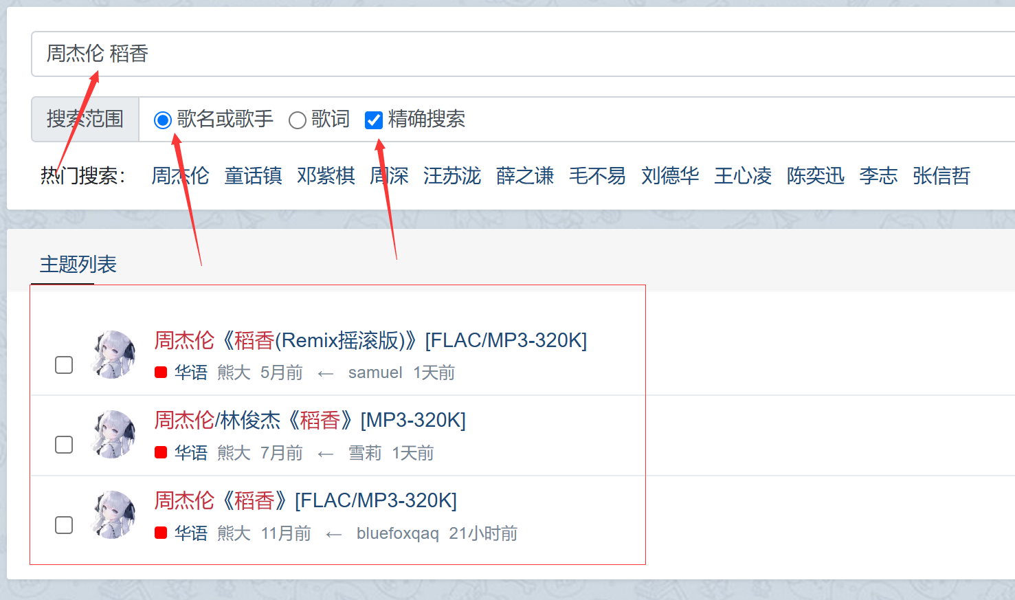 解释:大家可以输入歌手(空格)歌名。(如:周杰伦 稻香) 然后点击精准搜索前面那个小方块(如下图所示)。