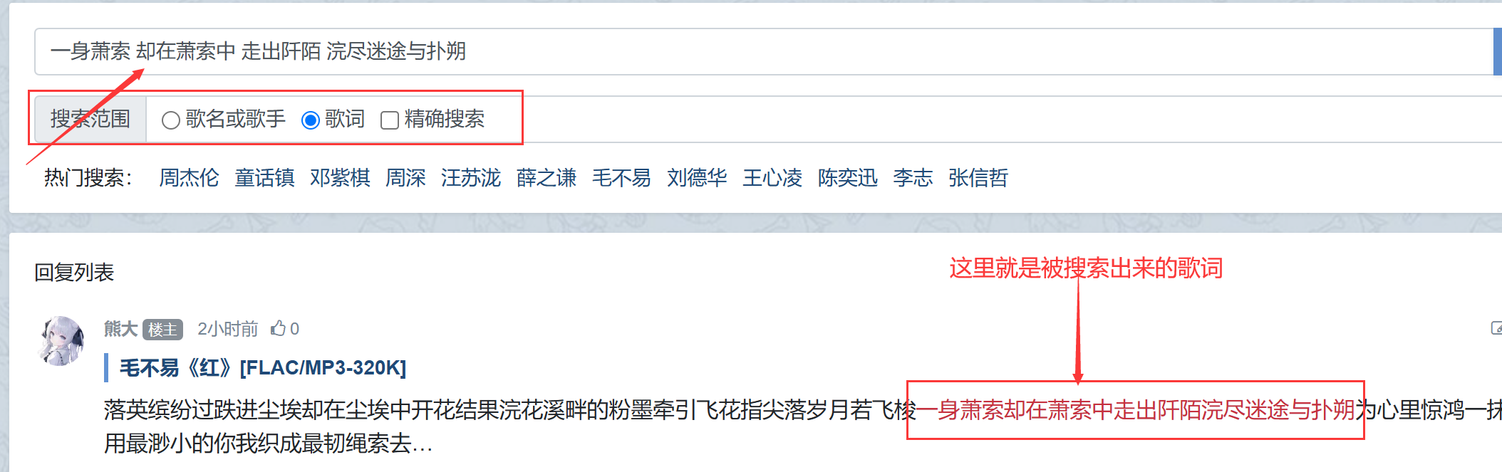 注意:使用搜索功能需要切换为歌词搜索,如下图所示,点击歌词前面的小圆圈即可。